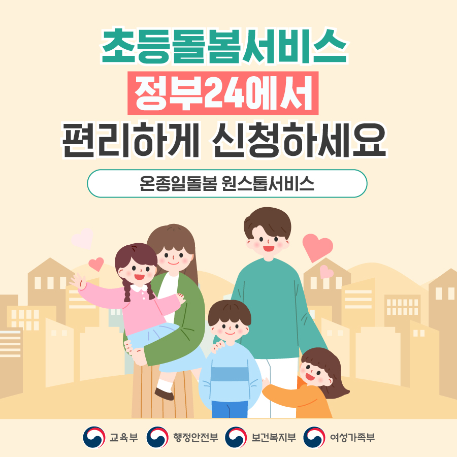 | 이용절차 | ▶ 정부 24 '온종일 돌봄 원스톱 서비스'를 통해 신청하면 됨 ▶ 학교돌봄터는 학교 사정에 따라 학기초 가정통신문으로도 신청 할 수 있음 |