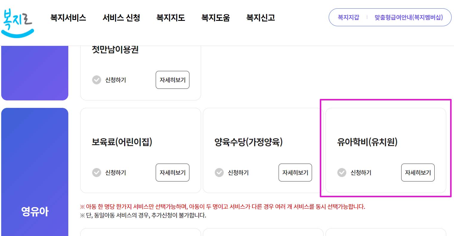 로그인 > 서비스 신청 >> 복지급여 신청 > 유아학비 > 대상 서비스 선택